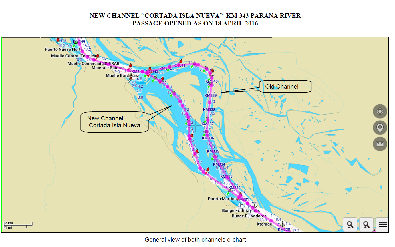 As from 18th April 2017 the Navigational Authorities established as main channel the “PASO CORTADA ISLA NUEVA” which goes from Km 335 to Km 345 of the Parana River, replacing the previous one which was round the island.