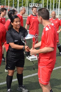 The manager of Team International thanking the female referee for a fair game.